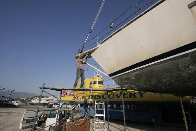 07.10.2015 – Antonio und sein Compagnero beginnen mit der Arbeit am Rumpf. Alles Abschleifen. Die Arbeit am Unterwasserschiff ruht. Skipper und Elke reinigen das Deck, um auch dort neu zu malen. Die 90 m lange Ankerkette kommt raus wird sauber auf ein Holzgestell gehängt ohne Bodenberührung. Die Ankerkiste gereinigt. Dabei wird eine Schwachstelle im Fundament der Ankerwinsch entdeckt. Jessica besorgt eine Fachfirma aus Almeria.