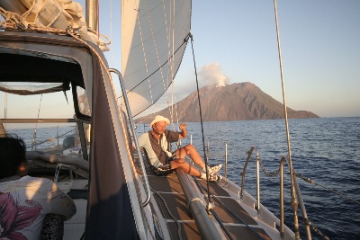 10.08.2015 – Die Crew erklimmt den Vulkan. Die Fähren verursachen heftigen Schwell, der Anker hält nicht mehr. Crew rechtzeitig zurück zum Ablegen. 12.20 fest in Lipari am Schwimmsteg nach 8 nm. Aber es brechen bange Stunden an. Falls der angesagte Gewittersturm auf Ost drehen sollte, muss der Steg geräumt werden. Die Böen bis 30 kn fallen von SW ein. Alle müssen an Bord bleiben. Um 22.00 geben die Marineros Entwarnung. Gewitter is over.