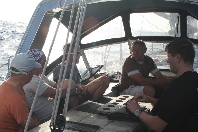 Dann kann der Spi vier Tage am Stück eingesetzt werden. Der 60-Fuß-Racer AKENA aus Frankreich zieht vorüber, der erste von zwei Funkkontakten der gesamten Reise. Die beiden Segler an Bord nehmen in einem Feld von 14 Booten an einem Race nach Salvador Bahia teil und suchen ebenfalls mehr Wind. Nach längerer Pause kommt der Wind zurück und der Spi geht wieder rauf. Doch in der zweiten Nacht geht eine Quernaht auf, genau zum Wachwechsel um Mitternacht. Walter macht fast täglich Messungen mit seinem Sextanten. Als früherer U-Boot-Navigator kann er es nicht lassen. Hans, der Autohändler in Ruhe, genießt die Reise, die er sich zum 60. geschenkt hat. Und Rüdiger, Seemann und langjähriger Mitarbeiter des BSH, freut sich am Bordleben und an den Segelqualitäten der DAISY. Der Impeller des Generators muss gewechselt werden, die Verklickerbeleuchtung am Besanmast wird erneuert und ein Scheinwerfer am Großmast ausgebaut. Langweilig wird es dem Skipper und seiner Crew nicht. Als der Wind länger als erwartet ausbleibt, und zwar bereits südlich des 20. Breitengrades, muss der Diesel helfen. 300 sm nach Südwesten schiebt er DAISY nun doch noch in die Passatzone hinein. Aber wertvolle Zeit ist verstrichen. Aus 17 werden 21 Tage. Ach ja, der zweite Funkkontakt: Zwei Tage vor Tobago läuft ein Fischkutter entgegen, Abstand 3 Meilen.“Hello, hello!“, ruft es aus dem Funkgerät. „Are you okay?“ Der DAISY-Skipper meldet sich und erklärt sich. Mit einem munteren: “Have a nice trip”, verschwindet der Kutter am Horizont.